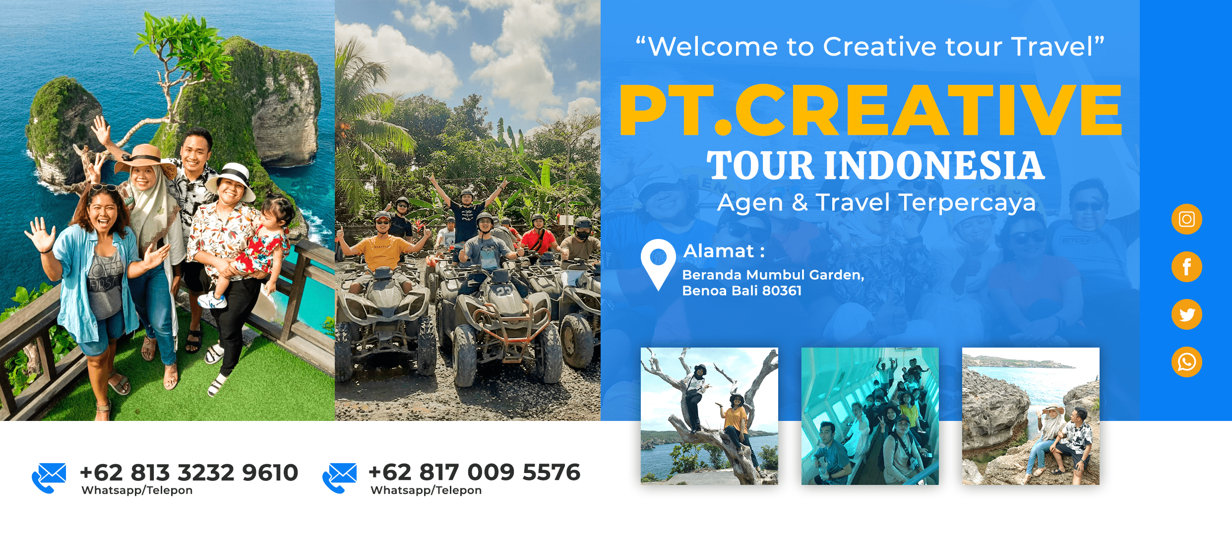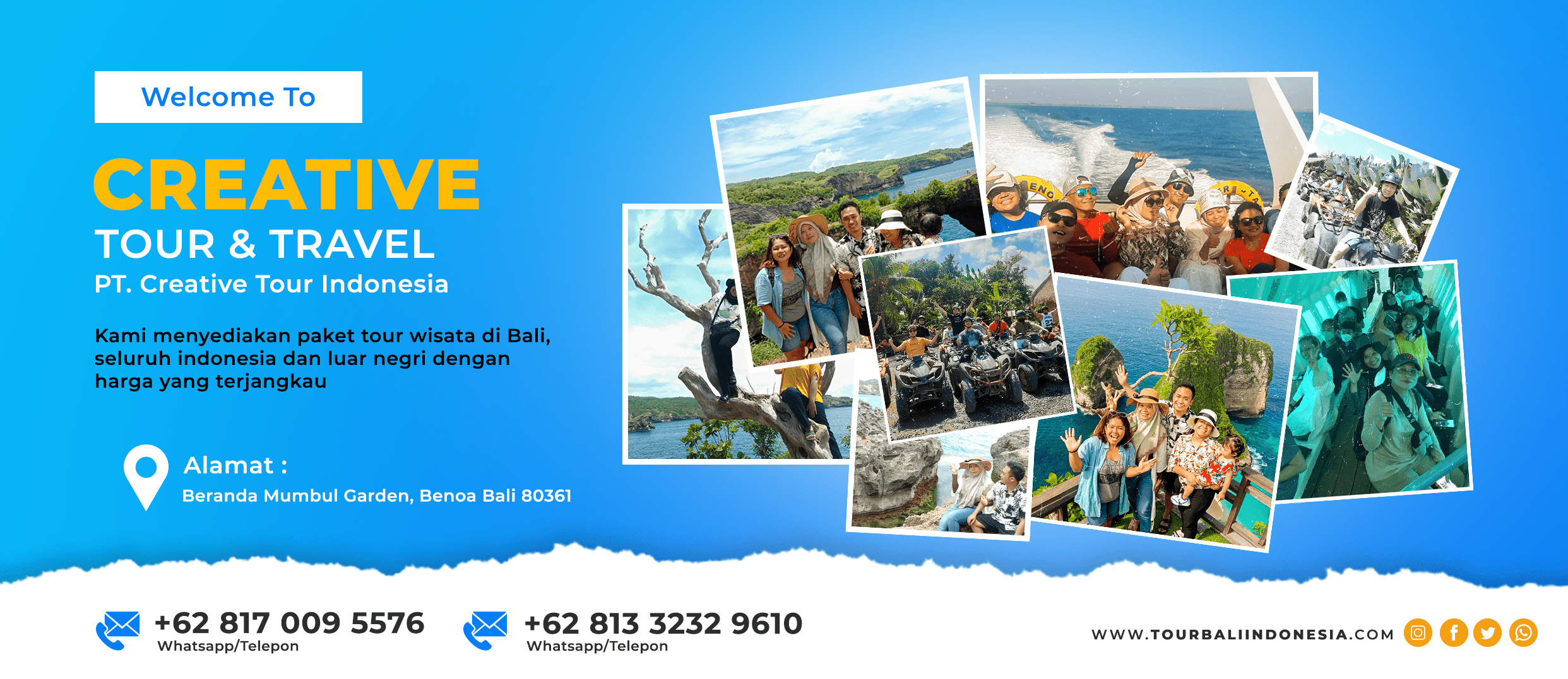 Creative Tour Indonesia adalah agen tour dan travel di Bali yang berbadan hukum. Kami berlokasi di Beranda Mumbul Garden, Balo Benoa 80361, Bali.
